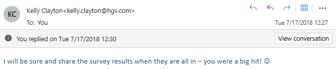 "I will be sure and share the survey results when they are all in -- You were a big hit!"